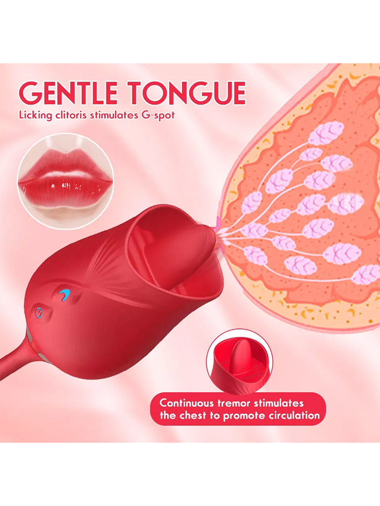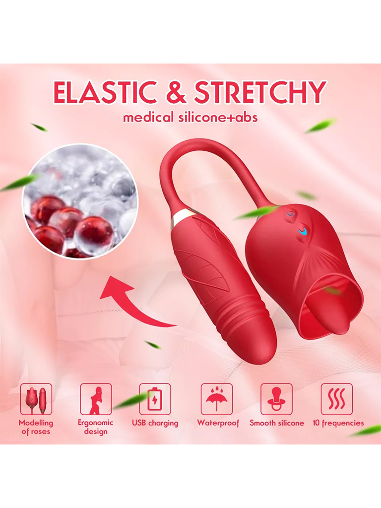 Diseñado con dos extremos para satisfacer todas tus necesidades, un extremo cuenta con una potente bala vibradora y el otro con una rosa que contiene una lengua para simular una estimulación oral perfecta. Ambos extremos cuentan con motores diferente que se controlan por separado para una experiencia personalizada. Vivirás una experiencia totalmente única, placentera y excitante.